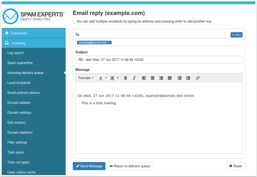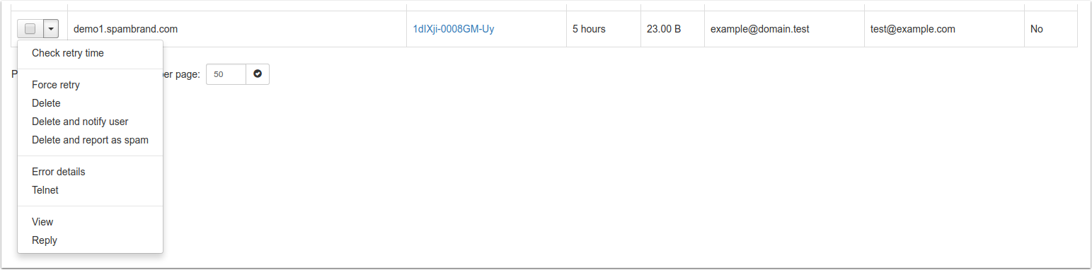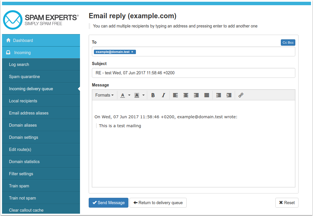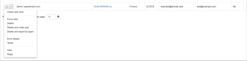Whilst a message is queued you can reply to it directly from the webinterface by using the "Reply" option from the message options: