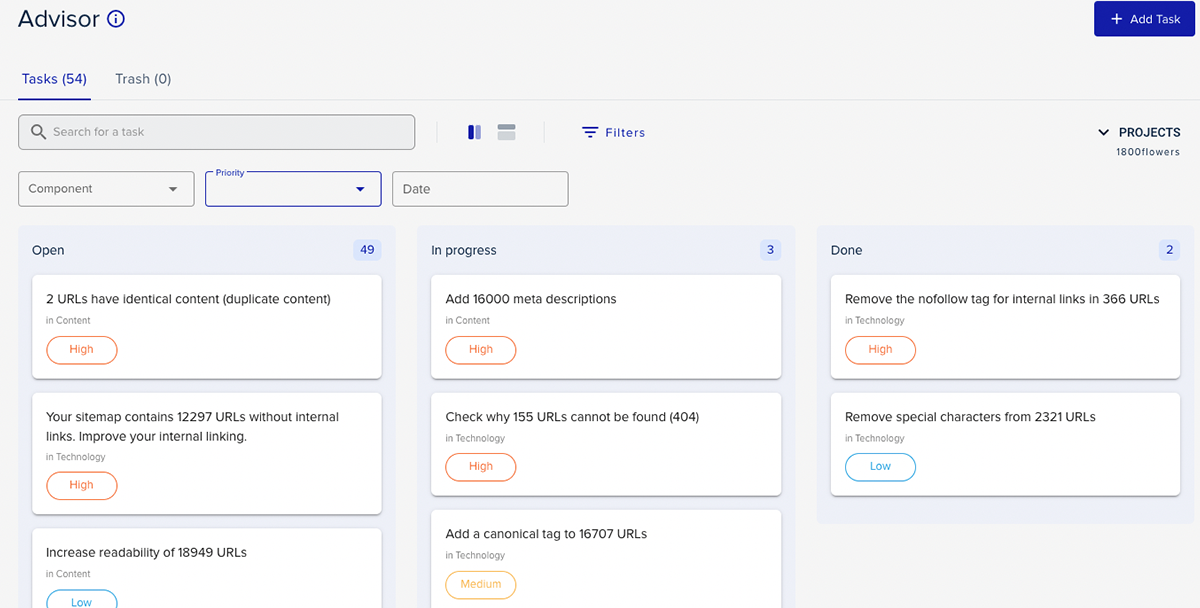 Keep in mind that you do need a Project for the Advisor feature to work. Also, most of the Advisor's tasks are tailored to a Project's website (usually yours or your client's). If you manage more than one website, you'll need to create an extra Project for each of them.